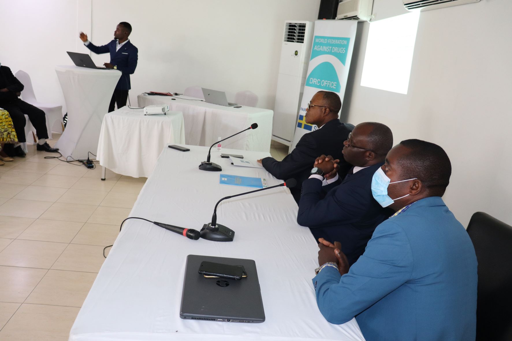 Ce lundi 9 mai 2022, la World Federation Against Drugs, WFAD en sigle et ses partenaires avec l’accompagnement du Ministère de la Santé Publique, Hygiène et Prévention de la RDC ont organisé une conférence de presse à la Maison de France dans la commune de la Gombe grâce à l’appui financier de la Coopération suédoise. Cette rencontre avec les professionnels des médias avait pour objectif la présentation des résultats des analyses en laboratoire de l’échantillon de la fameuse drogue ‘Bombé’ ainsi que des résultats de la pré-étude de cartographie des organisations œuvrant dans la lutte contre l’abus de drogues dans la ville de Kinshasa, financée par l’organisation suédoise ForumCiv et menée en collaboration avec le Programme National de Lutte Contre les Toxicomanies –PNLCT-, l’Ecole de Criminologie de l’Université de Kinshasa et l’ONG Interactions RDC.
